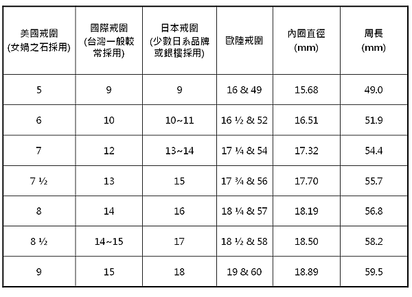 許多人在網路上選購戒指時,總是對於如何挑選適合自己的戒指尺寸(戒圍),感到相當困擾;因此,團隊特別準備了美國戒圍和國際上幾套標準尺寸的對照表: