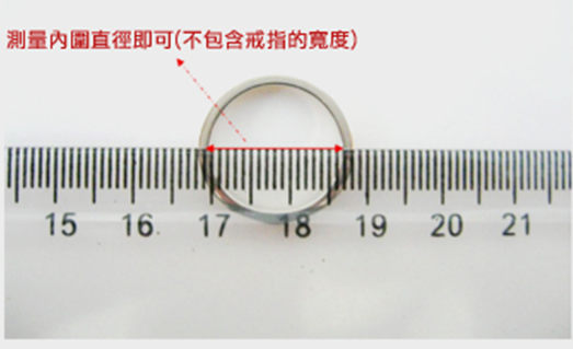 而測量適合您的戒圍,最簡單的方式是依您目前配戴的戒指尺寸,並依對照表轉換為美國尺寸即可。您也可以直接用尺測量戒指內圈的內圈直徑長度,再依照對照表的內圈直徑找出對應的美國戒圍尺寸: